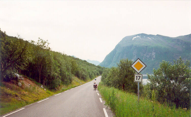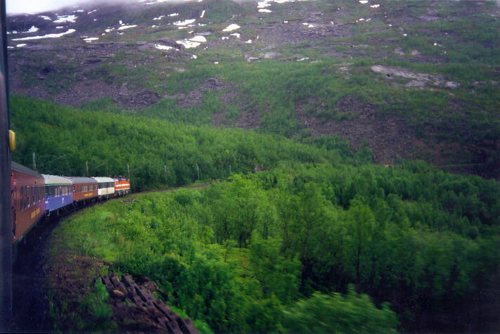 Herausforderung (wir hatten beide keinerlei Erfahrung mit solchen Touren). Wohlmeinenden Ratschlägen von Bekannten, doch lieber erst einmal in flacheren Gefilden zu radeln, zum Trotz konkretisierten wir im Laufe eines knappen Jahres unsere Vorstellungen, betrieben eine gründliche Vorbereitung (inkl. der Diskussion, ob man nun einen kleinen Löffel mitnehmen sollte oder darauf verzichten kann), holten jede nur greifbare Information ein und starteten am 8.7.94 wohlgemut in unser kleines "Abenteuer". Es begann mit einer dreitägigen Anreise mit dem Zug von Jena über Berlin, Saßnitz, Malmö, Stockholm (ein Tag unfreiwilliger Aufenthalt) und Kiruna nach Narvik (im Norden Norwegens, schon ein gutes Stück über den Polarkreis hinaus). | ||